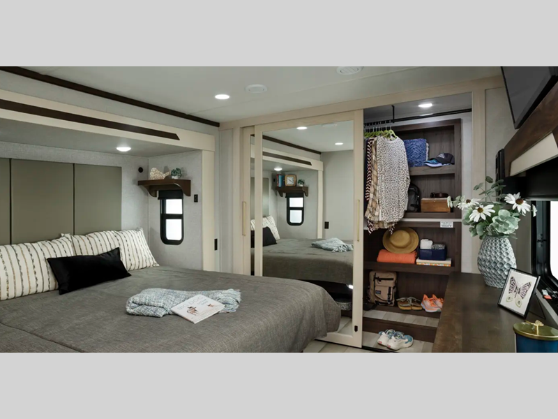 The new 101" wide body frame will provide you with more space to stretch out and relax, and the "True" gelcoat exterior is the best of the best in exteriors! Each model also includes Road Warrior suspension for better handling, and the Gen 3 leveling system will have you set up in no-time. Inside, you'll enjoy flush floor slides in the kitchen and living area, easy to clean vinyl floor covering, blackout night shades in the bedroom, plus many more comforts.