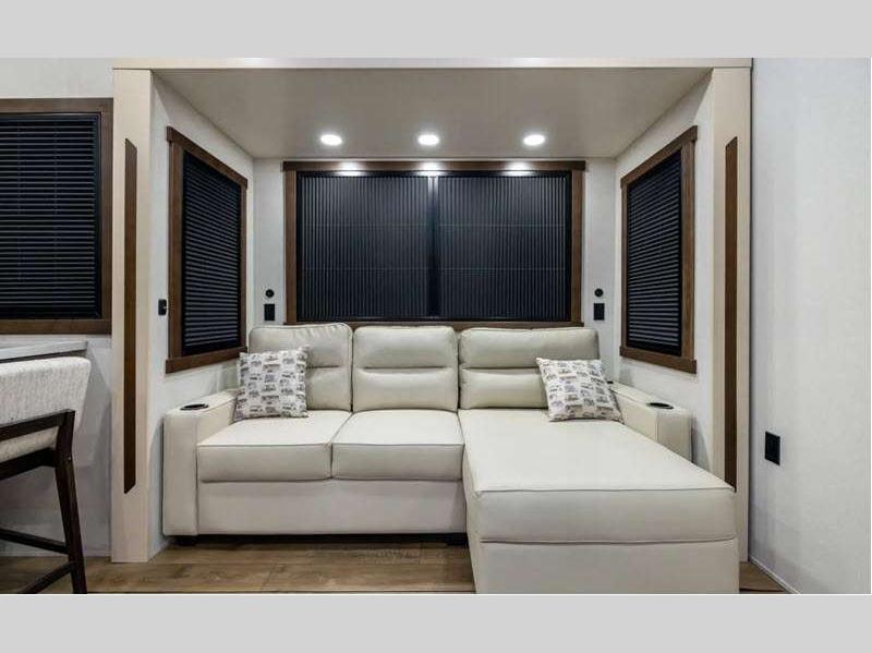 Sleeps 3 Slides 4 Length 41 ft 9 in Ext Width 8 ft 5 in Ext Height 13 ft 3 in Exterior Color Opt. Full Body Paint; Onyx, Sapphire, Opal Hitch Weight 2690 lbs GVWR 18000 lbs Dry Weight 14779 lbs Cargo Capacity 3221 lbs Fresh Water Capacity 75 gals Grey Water Capacity 123 gals Black Water Capacity 82 gals Available Beds King Refrigerator Type 110V Refrigerator Size 20 cu ft Cooktop Burners 3 Shower Size 48" x 30" Number of Awnings 1 Water Heater Type Suburban Tankless TV Info LR 50" Smart TV, BR 32" Smart TV, Ext. 50" TV Awning Info 21' w/ LED Night Lighting Axle Count 2 Shower Type Shower w/Seat Solar Wattage 200 watts Similar Floorplans