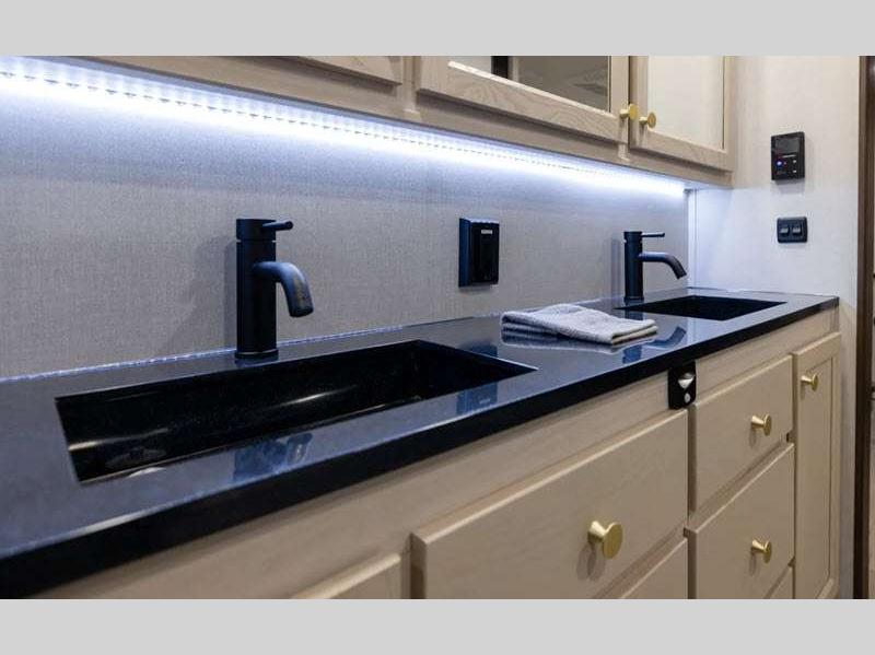 Sleeps 6 Slides 4 Length 43 ft 5 in Ext Width 8 ft 5 in Ext Height 13 ft 3 in Exterior Color Opt. Full Body Paint; Onyx, Sapphire, Opal Hitch Weight 2490 lbs GVWR 18000 lbs Dry Weight 15429 lbs Cargo Capacity 2571 lbs Fresh Water Capacity 75 gals Grey Water Capacity 82 gals Black Water Capacity 82 gals Available Beds King, Murphy Refrigerator Type 110V Refrigerator Size 20 cu ft Cooktop Burners 3 Shower Size 48" x 30" Number of Awnings 2 Water Heater Type Suburban Tankless TV Info LR 50" Smart TV, BR 32" Smart TV Awning Info With LED Night Lighting Axle Count 2 Washer/Dryer Available Yes Shower Type Shower w/Seat Solar Wattage 200 watts Similar Floorplans