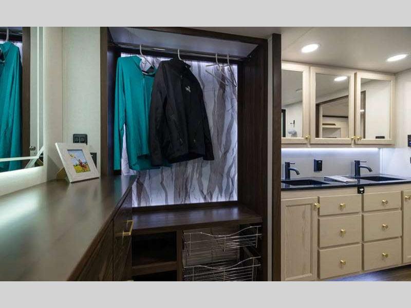 The 101" wide body frame will provide you with more space to stretch out and relax, and the "True" gelcoat exterior is the best of the best in exteriors! Each model also includes Road Warrior suspension for better handling, and the Gen 3 hydraulic leveling system will have you set up in no-time. Inside, you'll enjoy vinyl floor covering in the kitchen and living area, easy to clean, 12V motion lighting in the closet in the bedroom, plus many more comforts.