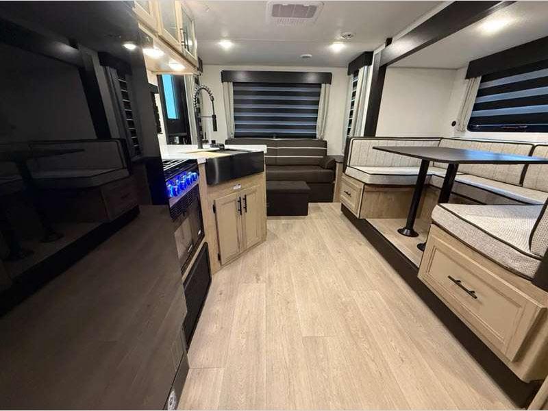 Sleeps 9 Slides 1 Length 32 ft 8 in Ext Width 8 ft Ext Height 10 ft 8 in Int Height 0 ft Hitch Weight 888 lbs GVWR 7888 lbs Dry Weight 6773 lbs Cargo Capacity 1115 lbs Fresh Water Capacity 52 gals Grey Water Capacity 38 gals Black Water Capacity 28 gals Furnace BTU 20000 btu Number Of Bunks 2 Available Beds RV King Refrigerator Type 12V Cooktop Burners 3 Number of Awnings 1 Water Heater Type Tankless AC BTU 15000 btu Cargo Deck Size 0 ft Awning Info 15' Full Length Power w/LED Light Strip Axle Count 2 Shower Type Tub/Shower Combo Solar Wattage 200 watts Similar Floorplans
