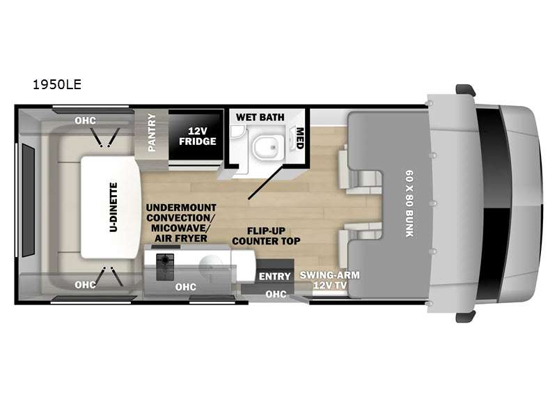 Upon entering this unit, you’re greeted by a spacious 60" x 80" cab-over bunk, providing plenty of comfortable sleeping space for family or guests. Near the entrance, a swing-arm 12V TV lets you enjoy your favorite shows and movies while on the road. Moving toward the center, you’ll find a pantry and a 10.7 cu. ft. refrigerator, perfect for storing both fresh groceries and dry goods. Adjacent to it is the well-designed wet bath, equipped with an oxygen-infused showerhead and flexible extension for a refreshing experience, complemented by a shower skylight and electric roof fan for added light and ventilation. Across the way, the kitchen comes fully equipped with a recessed two-burner range and flush glass cover, a convection microwave/air fryer, and a flip-up countertop that expands your workspace, making meal prep easy and efficient. At the rear, the inviting U-shaped dinette offers a cozy spot to relax, dine, or gather with friends, and at night, it effortlessly converts into an additional sleeping area so you can rest in complete comfort.