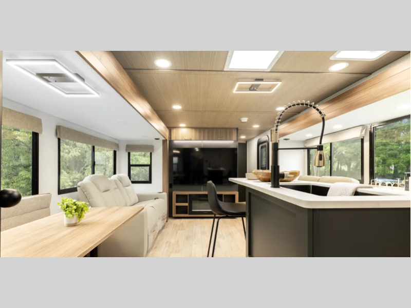 Sleeps 4 Slides 1 Length 34 ft Ext Width 8 ft Ext Height 11 ft 4 in Int Height 6 ft 8 in Hitch Weight 875 lbs Dry Weight 6938 lbs Cargo Capacity 2737 lbs Fresh Water Capacity 38 gals Grey Water Capacity 96 gals Black Water Capacity 30 gals Available Beds Custom King Refrigerator Type 12V Refrigerator Size 10.7 cu ft Convection Cooking Yes Cooktop Burners 3 Number of Awnings 1 Water Heater Type On Demand Tankless TV Info LR 65" Smart TV Awning Info 20' Axle Count 2 Washer/Dryer Available Yes Shower Type Walk-In Shower Similar Floorplans