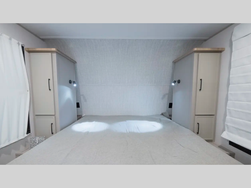 Sleeps 2 Slides 2 Length 29 ft 11 in Ext Width 8 ft Ext Height 11 ft 4 in Hitch Weight 805 lbs Dry Weight 6663 lbs Cargo Capacity 2942 lbs Fresh Water Capacity 38 gals Grey Water Capacity 96 gals Black Water Capacity 30 gals Available Beds Custom King Refrigerator Type 12V Refrigerator Size 10.7 cu ft Cooktop Burners 3 Shower Size 36" x 30" Number of Awnings 2 Water Heater Type On Demand Tankless AC BTU 31500 btu Awning Info 9'6" and 9'6" w/LED Lights Axle Count 2 Washer/Dryer Available Yes Shower Type Walk-In Shower Similar Floorplans