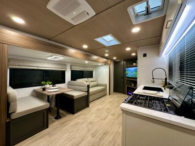 Sleeps 10 Slides 1 Length 34 ft 9 in Ext Width 8 ft Ext Height 11 ft 2 in Hitch Weight 1010 lbs Dry Weight 7048 lbs Cargo Capacity 2762 lbs Fresh Water Capacity 38 gals Grey Water Capacity 68 gals Black Water Capacity 30 gals Number Of Bunks 2 Available Beds King Refrigerator Type 12V Refrigerator Size 10.7 cu ft Cooktop Burners 3 Shower Size 40" x 30" Number of Awnings 1 Water Heater Type On Demand Tankless AC BTU 31500 btu TV Info LR TV Awning Info 20' w/LED Lights Axle Count 2 Washer/Dryer Available Yes Shower Type Standard Similar Travel Trailer Floorplans