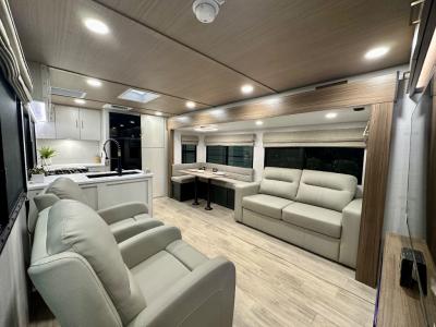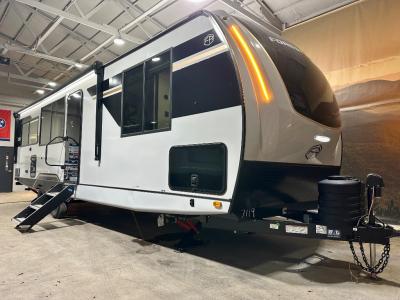 Sleeps 5 Slides 1 Length 34 ft Ext Width 8 ft Ext Height 11 ft 4 in Hitch Weight 875 lbs Dry Weight 6938 lbs Cargo Capacity 2737 lbs Fresh Water Capacity 38 gals Grey Water Capacity 96 gals Black Water Capacity 30 gals Available Beds Custom King Refrigerator Type 12V Refrigerator Size 10.7 cu ft Cooktop Burners 3 Shower Size 36" x 30" Number of Awnings 1 Water Heater Type On Demand Tankless AC BTU 31500 btu TV Info LR TV Awning Info 20' w/LED Lights Axle Count 2 Washer/Dryer Available Yes Shower Type Walk-In Shower Similar Travel Trailer Floorplans