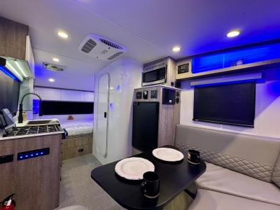 You will love the added space in this travel trailer that can sleep four people each night. There is a queen-size bed in the back, plus a convertible U-shaped dinette up front for the kids or your camping friends. The kitchen includes a two burner stainless steel cooktop, a stainless steel microwave, and a 4.5 12V compressor refrigerator for your perishables. You can also add the optional 10' power awning outside for shade as you visit with loved ones! This model has a dry weight that ranges from 3,113-3,543 lbs., a tongue weight between 465-495 lbs., and a carrying capacity between 525-610 lbs. When the optional Rover Package is chosen on this model, you'll enjoy rugged decals, a 3" lift, blackout wheels, and more; see dealer for more details!